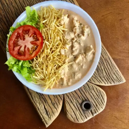 Frango desfiado, cenoura ralada, milho, azeitona, temperos, maionese da casa & finalizado com batata palha.