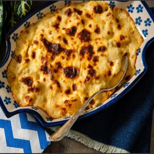 Uma camada de bacalhau refogado com temperos frescos, azeitonas, azeite, uma camada de purê de batata, bem levinho & fi... Ver completo
