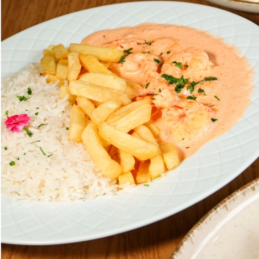 Filézinho de peixe linguado empanado e frito com camarões ao molho de catupiry cremoso.