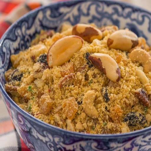 Farofa natalina - farinha de mandioca, temperos, bacon, castanhas e azeitonas.