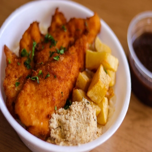 Iscas de frango à milanesa ao molho barbecue.